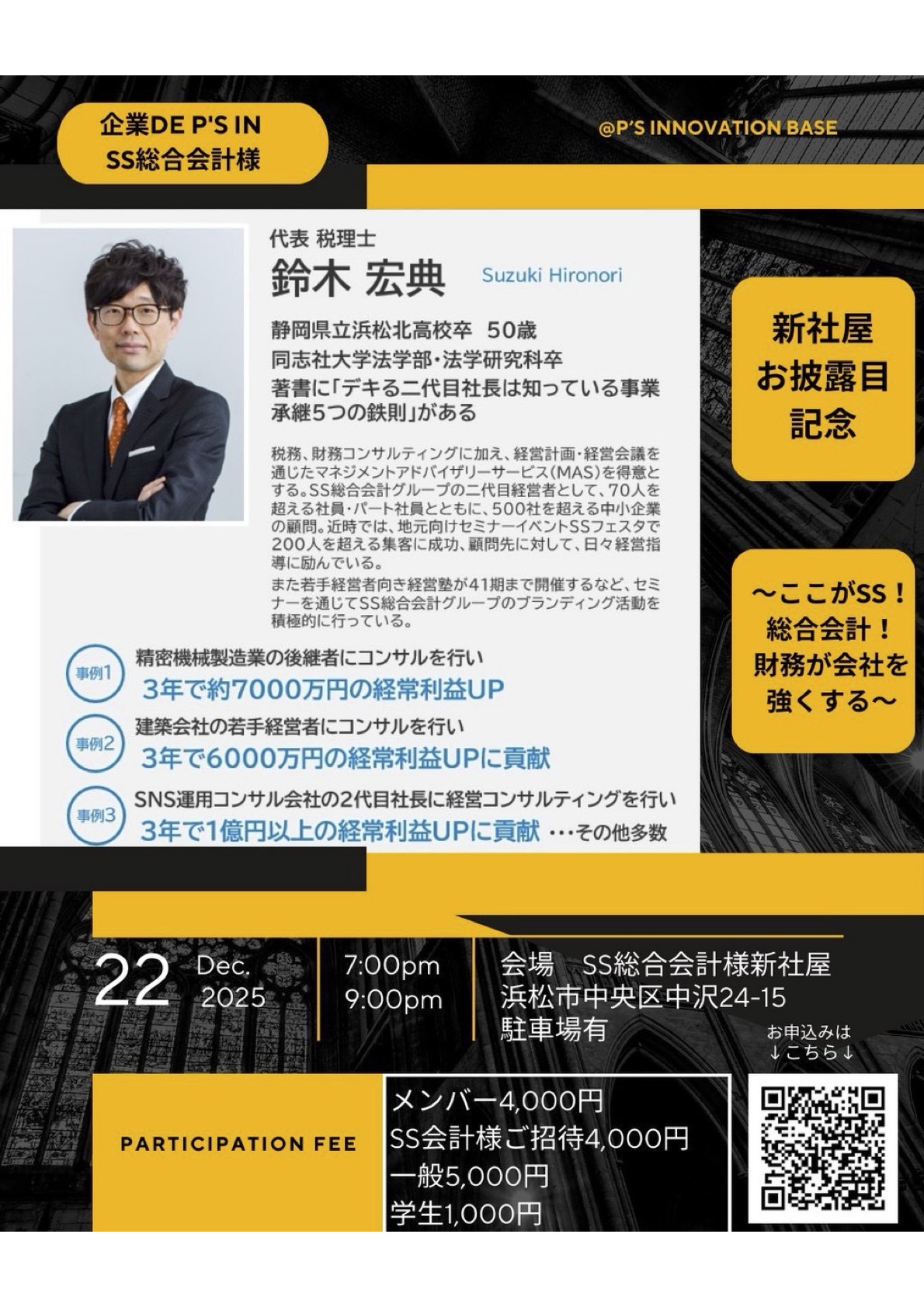 2025年12月のピース交流会は、毎年恒例の企業DEピースです!今年は、新社屋に移転されたSS総合会計様にお邪魔して12月22日(月) に開催します!